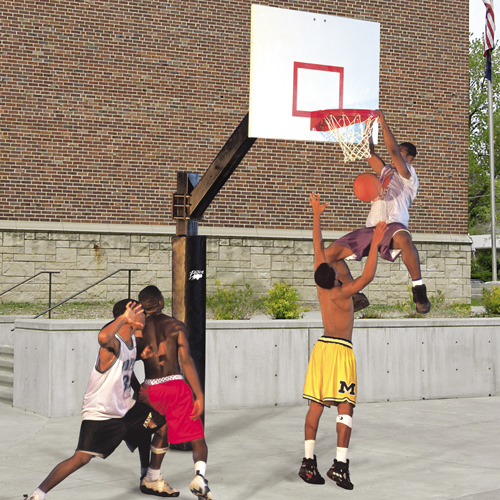 - Backboard is 42" x 60" 12 ga. steel with a white powder coated graffiti-resistant finish and safety rolled edges to eliminate sharp contact points