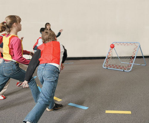 | Team Handball Perfect Angle on Game Play The BallBounder features one of the most effective rebound surfaces on the planet. It`s so fine-tuned that it`s capable of returning a ball thrown straight at it right back to the hand that threw it at roughly the same speed at which it was thrown. With a little practice a repetitive throw-to-catch-to-throw-again transition becomes as fluid as a home team`s stadium wave. At the heart of this game are 2 rebound nets. The nets are positioned at opposite ends of a basketball-sized court and are unique in two ways. First each has a 39" square (99.1cm) hyper- tensioned rebound surface set at a 55 angle. Second either team of up to 7 players each can use either net. One point is scored each time a rebounded ball hits the floor in fair territory and goes to the team of the thrower. However that same throw can earn a point for the opposing team if the ball hits the floor before hitting the net misses the net or lands out of fair territory. No player can take more than 3 steps with a ball and a team in possession has only 3 passes until they re forced to throw the ball at the rebound surface. No ball can be thrown while the player is standing within 3m (9.9 ) of the rebounder. Because no defense is allowed passes can`t be interfered with. Instead the players on the opposing team try to place themselves in positions where they can catch the ball off the rebound. The BallBounder can be used in the schoolyard instead of bats to send playballs into the field or in the training room to toss back plyometric balls.
