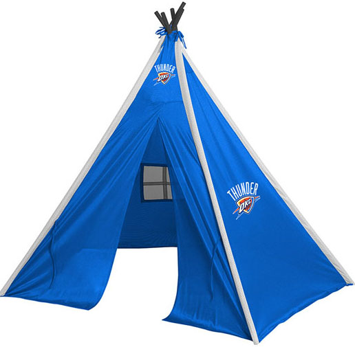 Remember playing under the dining table with a sheet thrown over for a roof. The Teepee Play Tent is the NEW version of that make-do playhouse that we loved to erect and pretend it was home! And like all great playhouses it stirs the imagination with a real door and window that open and close with flaps that tie. Your favorite team's colors and logos are vividly displayed on your play tent that is officially licensed. The pole sleeves are in the team's secondary color showing a pleasing contrast and using a second fabric called porthole jersey. The teepee is easily assembled using PVC poles which connect to a height of 72. The width at the widest point is 75. The Teepee Play Tent lets your young fan honor your team by bringing it home where passions and imagination can flourish! Fabric is machine washable. Features