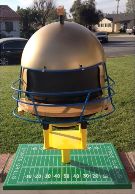 Touchdown 3000 and it is 14.5" Portable Charcoal BBQ Grill. It is made with 16 g cold rolled steel and reinforced for superior construction. The base is powder coated green and the field is silk screened on for that in the game feel. The uprights or stand is powder coated yellow for the extra point. The Charcoal bowl is ceramic coated for those high temperatures and the Helmet cover is painted with 700 degree paint to create that gridiron look. Features