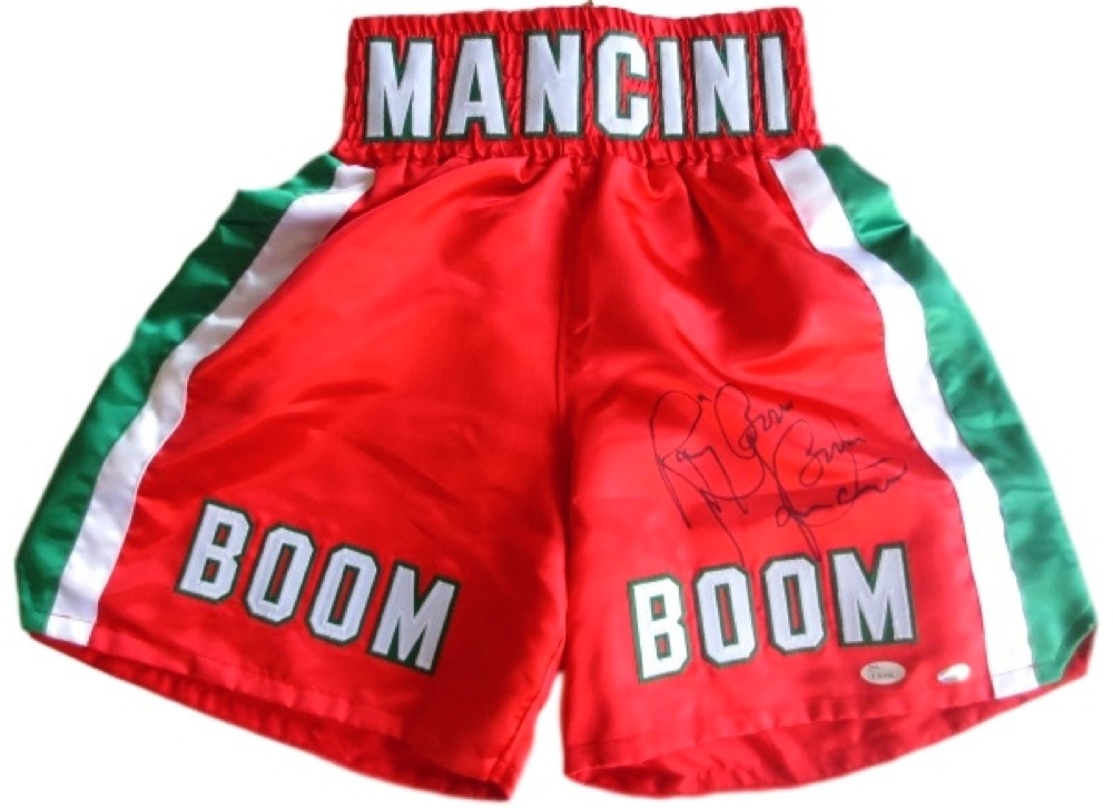 | Sports Integrity 10520 Ray Boom Boom Mancini Signed Red Boxing Trunks - JSA ITP |
