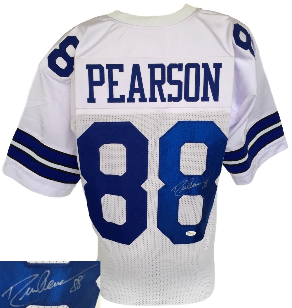 Sports Integrity works with various sports figures. Our product line features hundreds of unique collectables and has been directly involved in the sports memorabilia industry for the past two decades. Our auction services are ideal for all types of events from formal charity dinners golf tournaments and presented in an entertaining and professional style providing a fun approach and flair to fundraising. Featured is a signed Drew Pearson custom Dallas Cowboys white jersey. This jersey is professionally sewn and is size Large. Pearson was named All-Pro three times (1974 1976 - 77) All-NFC in 1975 and second Team All-NFC in 1978. In addition Pearson was a Pro Bowler in 1974 1976 and 1977. Pearson led the National Football Conference (NFC) in pass receptions in 1976 with 58. He served as offensive captain for the Cowboys in 1977 1978 1982 and 1983. Pearson was named one of the Top 20 Pro Football All-Time wide receivers he was also recognized for his achievements by being named to the NFL 1970s All-Decade Team. This jersey is certified by JSA and have their hologram and certificate of authenticity. This is not an NFL jersey. It has no logos tags or emblems. It is intended to be used as a sports collectible. Features