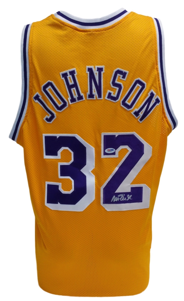 Sports Integrity is a company that works with various sports figures. Our product line features hundreds of unique collectables and has been directly involved in the sports memorabilia industry for the past two decades. Our auction services are ideal for all types of events from formal charity dinners golf tournaments and presented in an entertaining and professional style providing a fun approach and flair to fundraising. Featured is a Magic Johnson signed custom gold Los Angeles Lakers x-large jersey. After winning championships in high school and college Johnson was selected first overall in the 1979 NBA draft by the Lakers. He won a championship and an NBA Finals Most Valuable Player Award in his rookie season and won four more championships with the Lakers during the 1980s. Johnson's career achievements include three NBA MVP Awards nine NBA Finals appearances twelve All-Star games and ten All-NBA First and Second Team nominations. This jersey is certified by PSA and comes with their hologram and certificate of authenticity. This is a custom jersey and not to be associated with any league or it's teams. This is intended to be an autographed collectible. Features