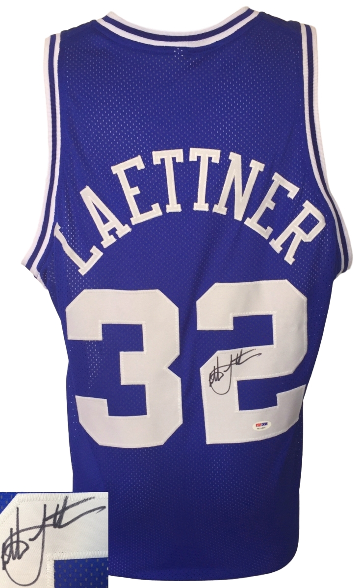 Sports Integrity is a company that works with various sports figures. Our product line features hundreds of unique collectables and has been directly involved in the sports memorabilia industry for the past two decades. Our auction services are ideal for all types of events from formal charity dinners golf tournaments and presented in an entertaining and professional style providing a fun approach and flair to fundraising. Featured is a Christian Laettner signed custom blue basketball jersey. This jersey features professionally sewn letters and numbers and is size XL. This jersey is certified by PSA and comes with their hologram and certificate of authenticity. This is a custom jersey and not to be associated with any league or it's teams. This is intended to be an autographed collectible. Laettner is highly regarded as one of the greatest college basketball players of all-time. He is most known for his game winning jump shot to beat Kentucky 104-103 in the 1992 National Championship game. Features