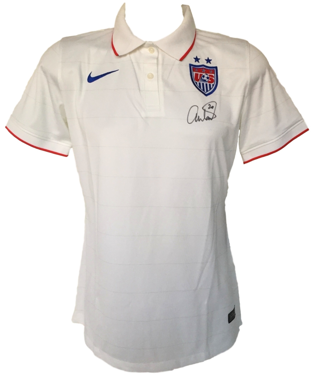 Sports Integrity works with various sports figures. Our product line features hundreds of unique collectables and has been directly involved in the sports memorabilia industry for the past two decades. Our auction services are ideal for all types of events from formal charity dinners golf tournaments and presented in an entertaining and professional style providing a fun approach and flair to fundraising. Featured is an Abby Wambach signed authentic team USA soccer jersey. The size of the jersey is a women's large. A six-time winner of the U. S. Soccer Athlete of the Year award Wambach has been a regular on the U. S. women's national soccer team since 2003. As a forward she currently stands as the highest all-time goal scorer for the national team and holds the world record for international goals for both female and male soccer players with 184 goals. Wambach has competed in four FIFA Women's World Cup tournaments: 2003 in the United States 2007 in China 2011 in Germany and 2015 in Canada being champion of the last edition; and two Olympics tournaments: 2004 in Athens and 2012 in London winning the gold medal on both. All together she has played in 29 matches and scored 22 goals at these five international tournaments. The jersey is hand signed by Abby Wambach and authenticated by JSA. The jersey includes a JSA Hologram and Certificate of Authenticity. Features