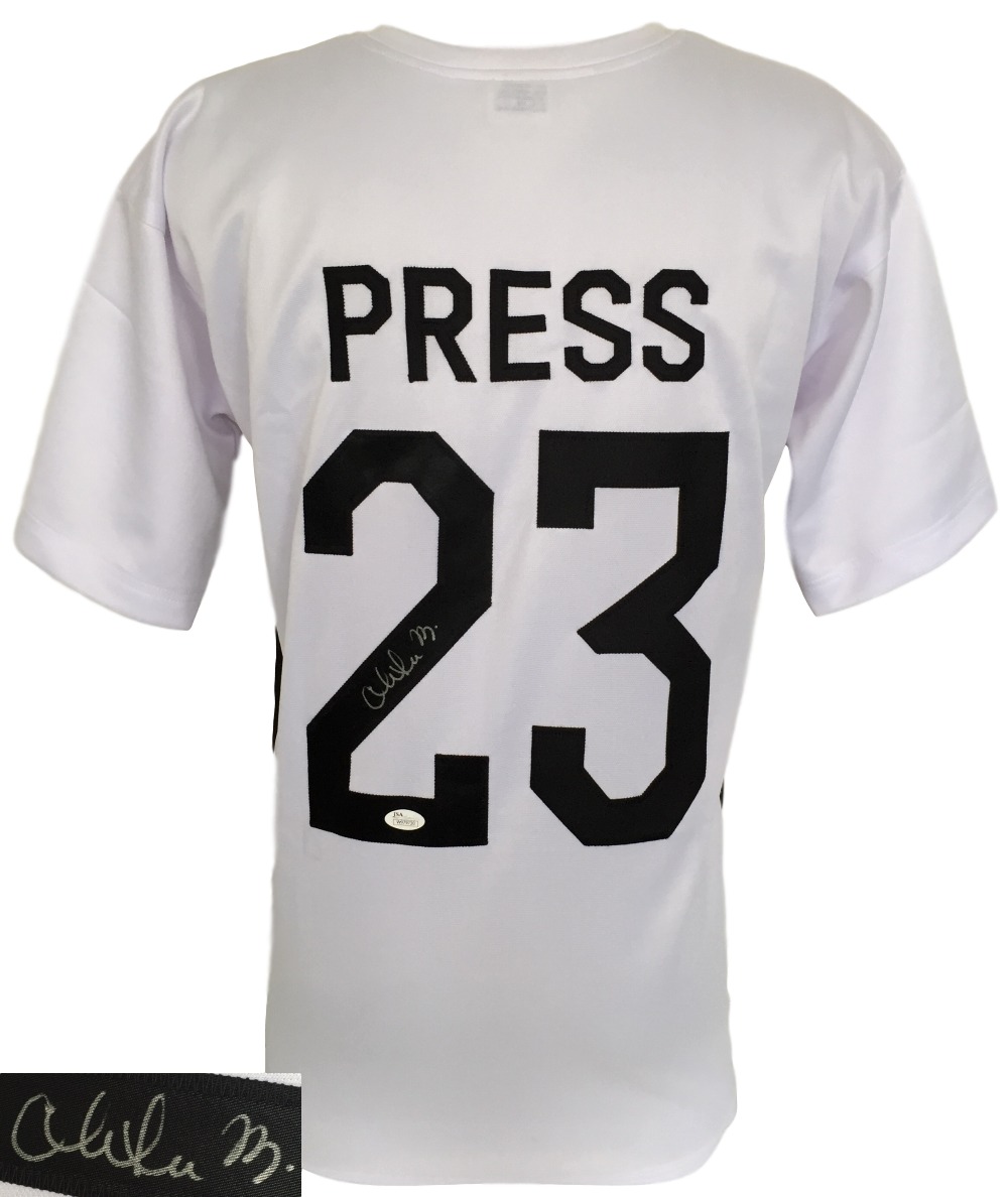 Sports Integrity works with various sports figures. Our product line features hundreds of unique collectables and has been directly involved in the sports memorabilia industry for the past two decades. Our auction services are ideal for all types of events from formal charity dinners golf tournaments and presented in an entertaining and professional style providing a fun approach and flair to fundraising. Feaured is a Christen Press autographed custom soccer jersey. This jersey features professionally sewn letters and numbers and is size Medium. This jersey is certified by JSA and have their hologram and certificate of authenticity. This is a custom jersey and not to be associated with any league or it's teams. This is intended to be an autographed collectible. Features