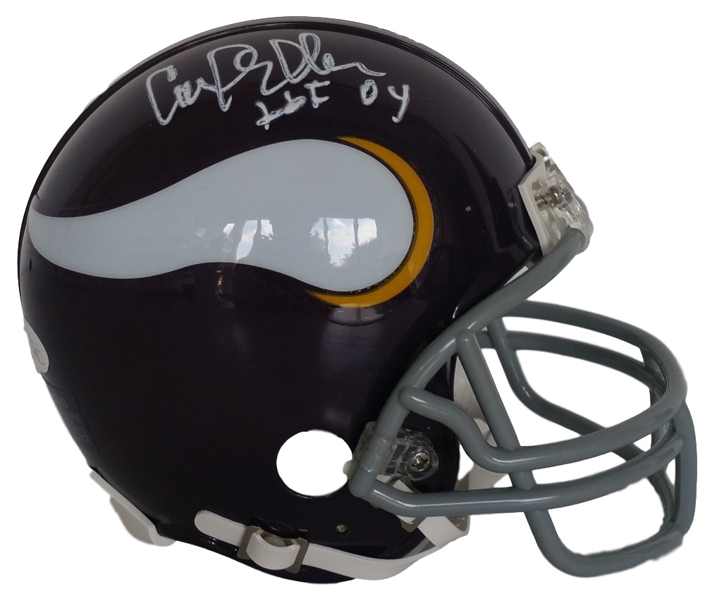 Sports Integrity works with various sports figures. Our product line features hundreds of unique collectables and has been directly involved in the sports memorabilia industry for the past two decades. Our auction services are ideal for all types of events from formal charity dinners golf tournaments and presented in an entertaining and professional style providing a fun approach and flair to fundraising. Featured is a Carl Eller signed Minnesota Vikings NFL mini inscribed HOF 04. This helmet was signed by Carl Eller and have a JSA Witnessed hologram and matching certificate of authenticity. In 1964 Eller was drafted in the first round of the NFL draft by the Minnesota Vikings and also drafted in the first round of the American Football League Draft by the Buffalo Bills who could not sign him. As the left defensive end in the Vikings front four he was a major factor in the unit known as the Purple People Eaters. Features