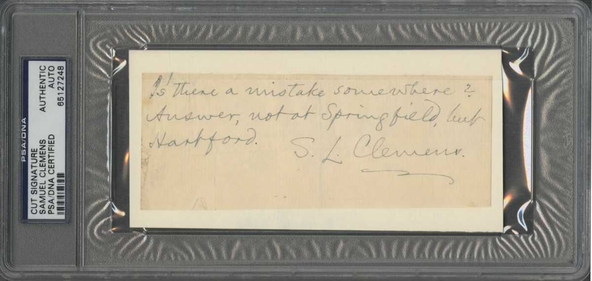Sports Integrity works with various sports figures. Our product line features hundreds of unique collectables and has been directly involved in the sports memorabilia industry for the past two decades. Our auction services are ideal for all types of events from formal charity dinners golf tournaments and presented in an entertaining and professional style providing a fun approach and flair to fundraising. Samuel Langhorne Clemens better known as Mark Twain is widely considered one of the greatest American authors. Twain during the height of his popularity lived in Hartford Connecticut where he wrote many of his popular novels which included “The Adventures of Tom Sawyer” “The Prince and the Pauper” “Life on the Mississippi” “Adventures of Huckleberry Finn” and “A Connecticut Yankee in King Arthur’s Court”. Twain and his family spent 17 years in Connecticut (1874-1891). Offered is a cut signature that is 2 ¼ x 5 ½ inches long and adhered to a 3 x 6 inch paper backing. The cut is inscribed in black pen “Is there a mistake somewhere? Answer not at Springfield but Hartford. ” and signed “S. L. Clemens. ” This remarkable signature and inscription has been encapsulated by PSA/DNA (65127248) in a 4 ½ x 9 ½ inch holder. Features
