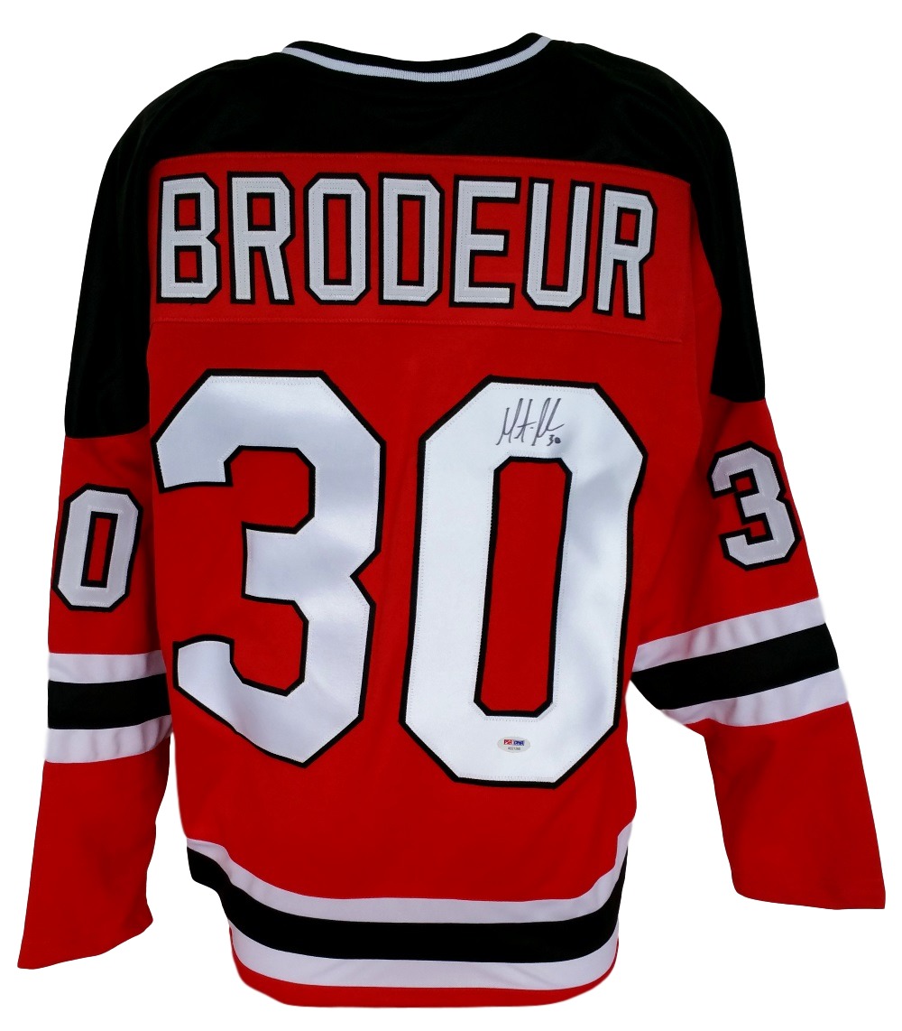 We Provides a full line of hand-signed memorabilia photo products. We have established ourselves as a reputable trustworthy and reliable offering Authentic photo Memorabilia. We provide everyone to enjoy shopping with trust safety and confidence. Every item is accompanied by a certificate of authenticity on the item. We value for our user requirements and we work for it every day. This jersey is certified by PSA and comes with a PSA hologram and certificate of authenticity. This is a professionally sewn jersey featuring sewn name and numbers. This is not an NHL jersey. It has no logos tags or emblems. It is intended to be used as a sports collectible. Martin Brodeur was a star goalie for the New Jersey Devils from 1991-2014. Brodeur holds numerous NHL and franchise records including all-time regular season wins (691) losses (397) shutouts (125) and games played (1 266). He is a four-time Vezina Trophy winner a five-time Jennings Trophy winner a ten-time NHL All-Star a Calder Memorial Trophy winner and one of only two NHL goaltenders to score a goal in both the regular season and the playoffs. Features