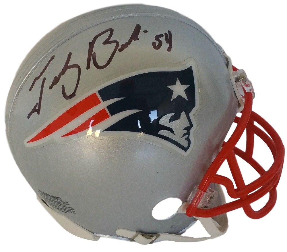 Sports Integrity works with various sports figures. Our product line features hundreds of unique collectables and has been directly involved in the sports memorabilia industry for the past two decades. Our auction services are ideal for all types of events from formal charity dinners golf tournaments and presented in an entertaining and professional style providing a fun approach and flair to fundraising. Featured is a Tedy Bruschi autographed New England Patriots mini helmet. This mini helmet have the Sports Integrity hologram and certificate of authenticity. Bruschi was the first player in NFL history to return four consecutive interceptions for touchdowns (his record was broken in 2015 by Pittsburgh Steelers cornerback William Gay with five) and his career total of four interceptions returned for touchdowns ranks second in Patriots history. He is tied for fourth in NFL history among linebackers and Bruschi is the only Patriots linebacker to return multiple interceptions for touchdowns in a single season (2002 and 2003). Additionally since 2002 Bruschi's defensive play has created seven defensive touchdowns. He scored four of those touchdowns on interception returns (two in both 2002 and 2003) forced two fumbles that were picked up and returned for touchdowns (October 3 and November 28 2004) and tipped a pass that was intercepted by James Sanders and returned for a touchdown (December 11 2005). This is in addition to his first career touchdown at Baltimore (October 6 1996) when Bruschi recovered a blocked punt by Larry Whigham and returned it four yards for a touchdown making 8 total touchdowns to which Bruschi contributed. Features
