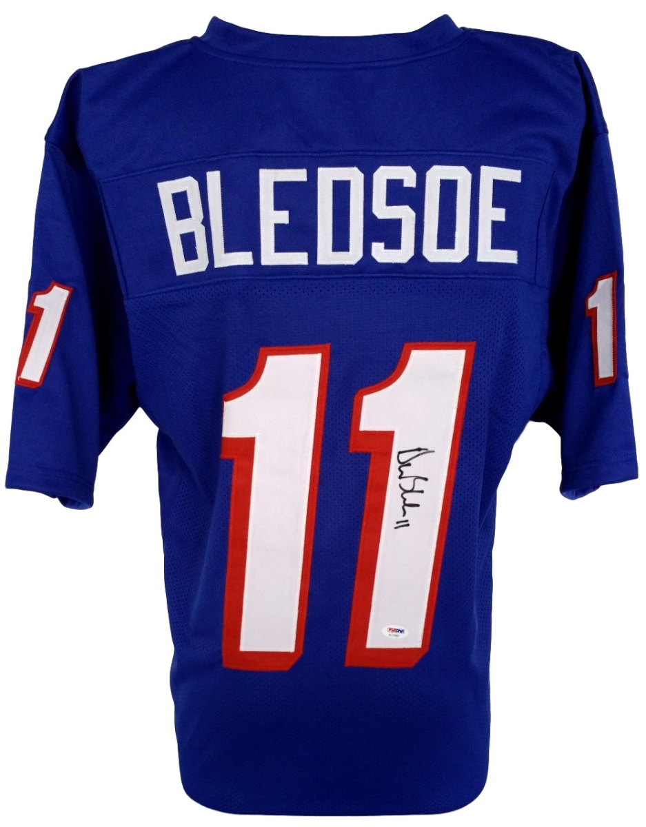 Sports Integrity works with various sports figures. Our product line features hundreds of unique collectables and has been directly involved in the sports memorabilia industry for the past two decades. Our auction services are ideal for all types of events from formal charity dinners golf tournaments and presented in an entertaining and professional style providing a fun approach and flair to fundraising. Featured is a Drew Bledsoe autographed custom football jersey. This jersey have the PSA hologram and certificate of authenticity. This is not an NFL jersey. It has no logos tags or emblems. It is intended to be used as a sports collectible. The first overall pick in 1993 NFL Draft Bledsoe helped improve the fortunes of the Patriots who had fallen on hard times. Under his tenure as starting quarterback the Patriots ended an eight-season postseason drought qualified for the playoffs six times and made one Super Bowl appearance. In his second season with the team he was named to the 1995 Pro Bowl and was the youngest quarterback to appear in the NFL's all-star game at the time. Features