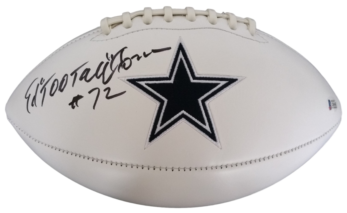 Sports Integrity works with various sports figures. Our product line features hundreds of unique collectables and has been directly involved in the sports memorabilia industry for the past two decades. Our auction services are ideal for all types of events from formal charity dinners golf tournaments and presented in an entertaining and professional style providing a fun approach and flair to fundraising. Featured is an Ed Too Tall Jones autographed Dallas Cowboys logo football. This football have the Beckett hologram and certificate of authenticity. Jones was one of the most dominant defensive players of his era playing in 16 playoff games and three Super Bowls. He was part of three NFC championship teams and the Super Bowl XII champion. Features