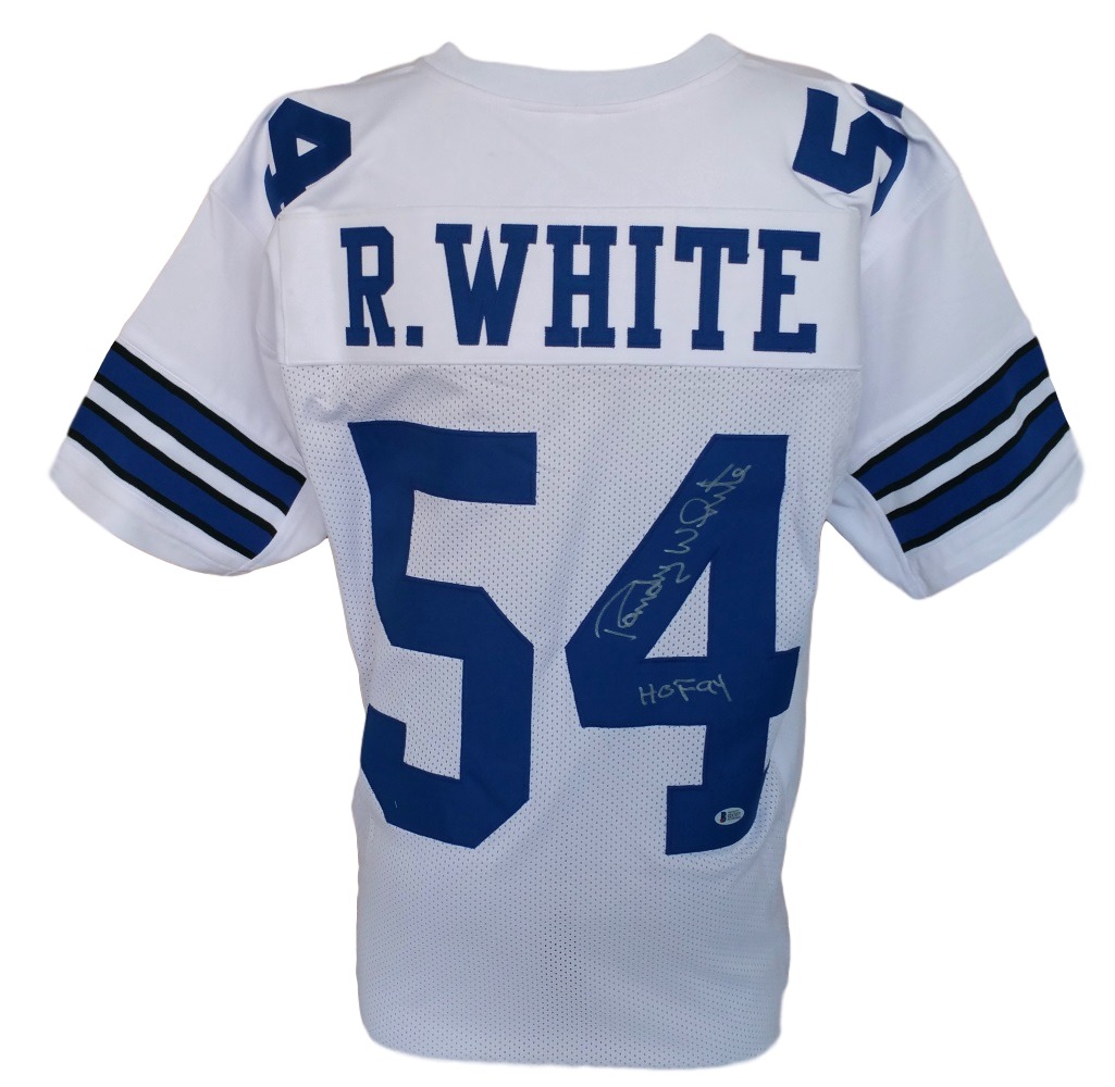 Sports Integrity works with various sports figures. Our product line features hundreds of unique collectables and has been directly involved in the sports memorabilia industry for the past two decades. Our auction services are ideal for all types of events from formal charity dinners golf tournaments and presented in an entertaining and professional style providing a fun approach and flair to fundraising. Featured is a Randy White autographed custom football jersey inscribed HOF 94. This jersey features professionally sewn letters and numbers. This jersey have the Beckett hologram and certificate of authenticity. This is not an NFL jersey. It has no logos tags or emblems. It is intended to be used as a sports collectible. White played professionally for the Dallas Cowboys from 1975 to 1988. He is a member of the College Football Hall of Fame the Pro Football Hall of Fame and the Delaware Sports Museum and Hall of Fame. Features