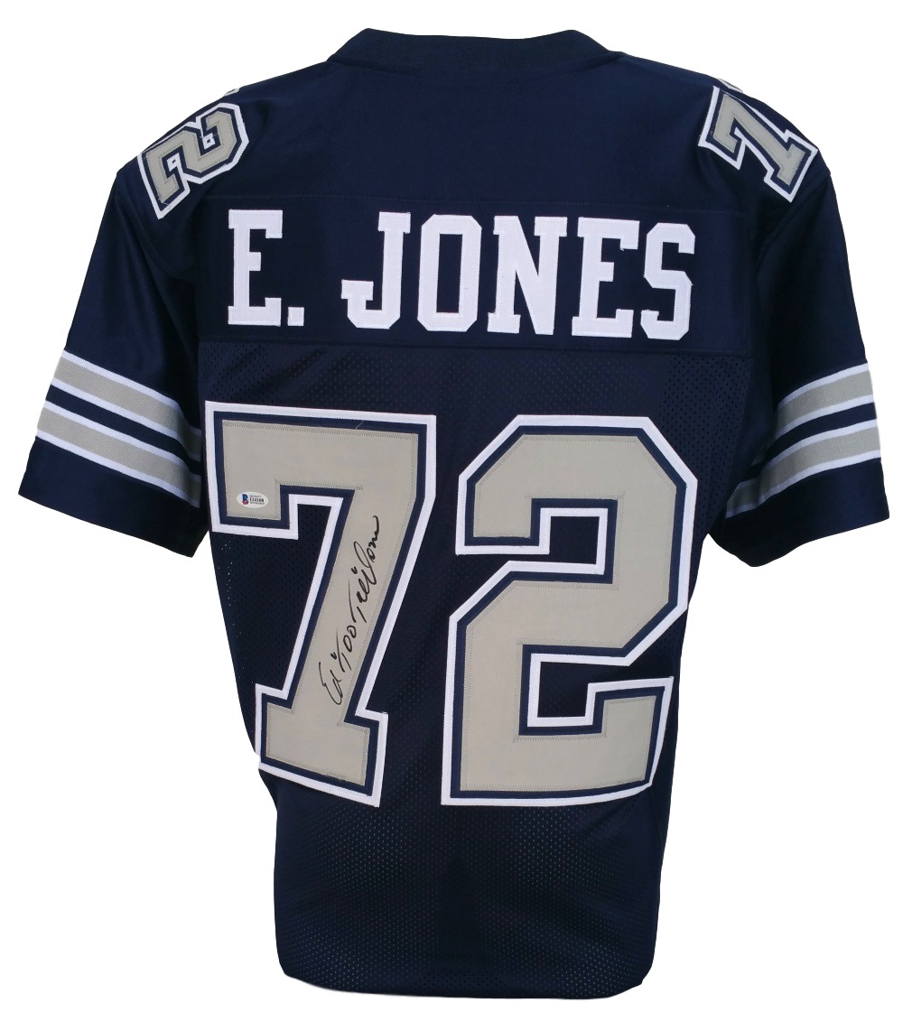 Sports Integrity works with various sports figures. Our product line features hundreds of unique collectables and has been directly involved in the sports memorabilia industry for the past two decades. Our auction services are ideal for all types of events from formal charity dinners golf tournaments and presented in an entertaining and professional style providing a fun approach and flair to fundraising. Featured is an Ed Too Tall Jones autographed custom football jersey. This jersey features professionally sewn letters and numbers. This jersey have the Beckett hologram and certificate of authenticity. This is not an NFL jersey. It has no logos tags or emblems. It is intended to be used as a sports collectible. Jones was one of the most dominant defensive players of his era playing in 16 playoff games and three Super Bowls. He was part of three NFC championship teams and the Super Bowl XII champion. Features