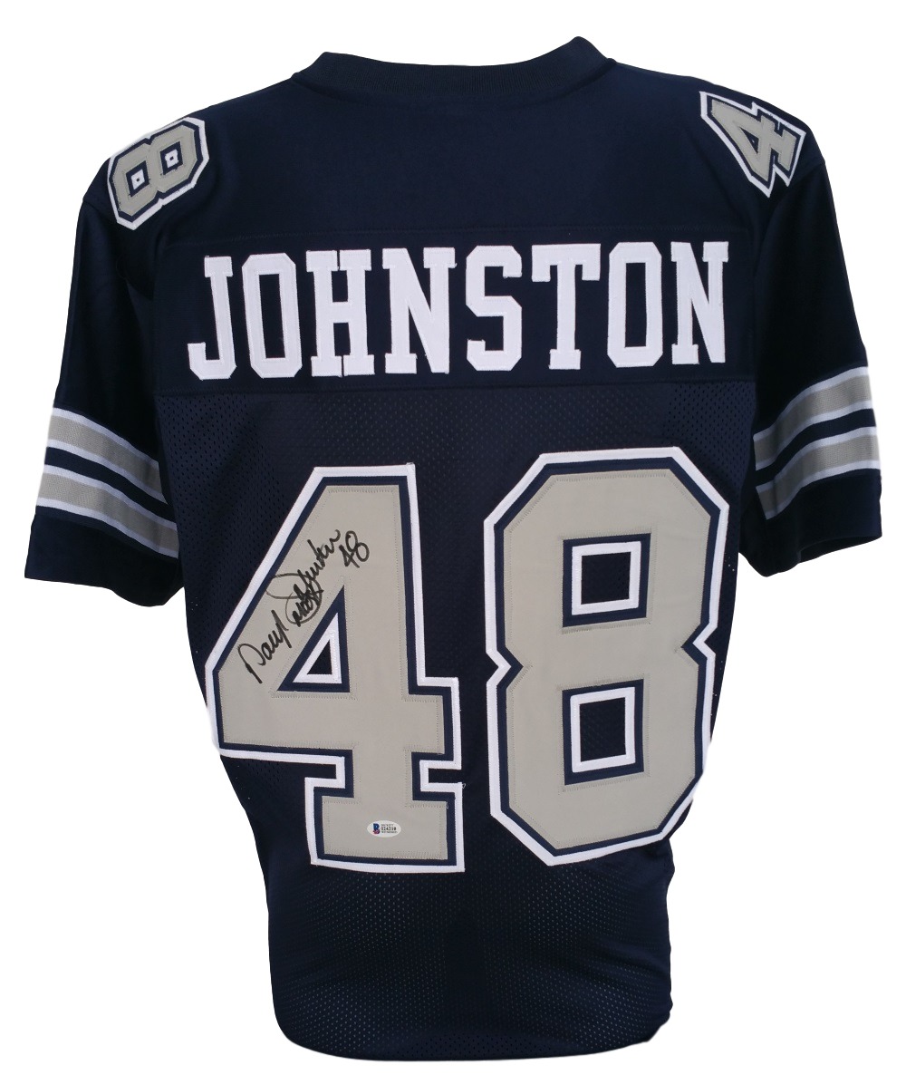 Sports Integrity works with various sports figures. Our product line features hundreds of unique collectables and has been directly involved in the sports memorabilia industry for the past two decades. Our auction services are ideal for all types of events from formal charity dinners golf tournaments and presented in an entertaining and professional style providing a fun approach and flair to fundraising. Featured is a Daryl Moose Johnston autographed custom football jersey. This jersey features professionally sewn letters and numbers. This jersey have the Beckett hologram and certificate of authenticity. This is not an NFL jersey. It has no logos tags or emblems. It is intended to be used as a sports collectible. Johnston was selected by the Dallas Cowboys in the second round (39th overall) of the 1989 NFL Draft. As a rookie he received his nickname Moose from backup quarterback Babe Laufenberg because of his large stature compared to the rest of the running backs. Features