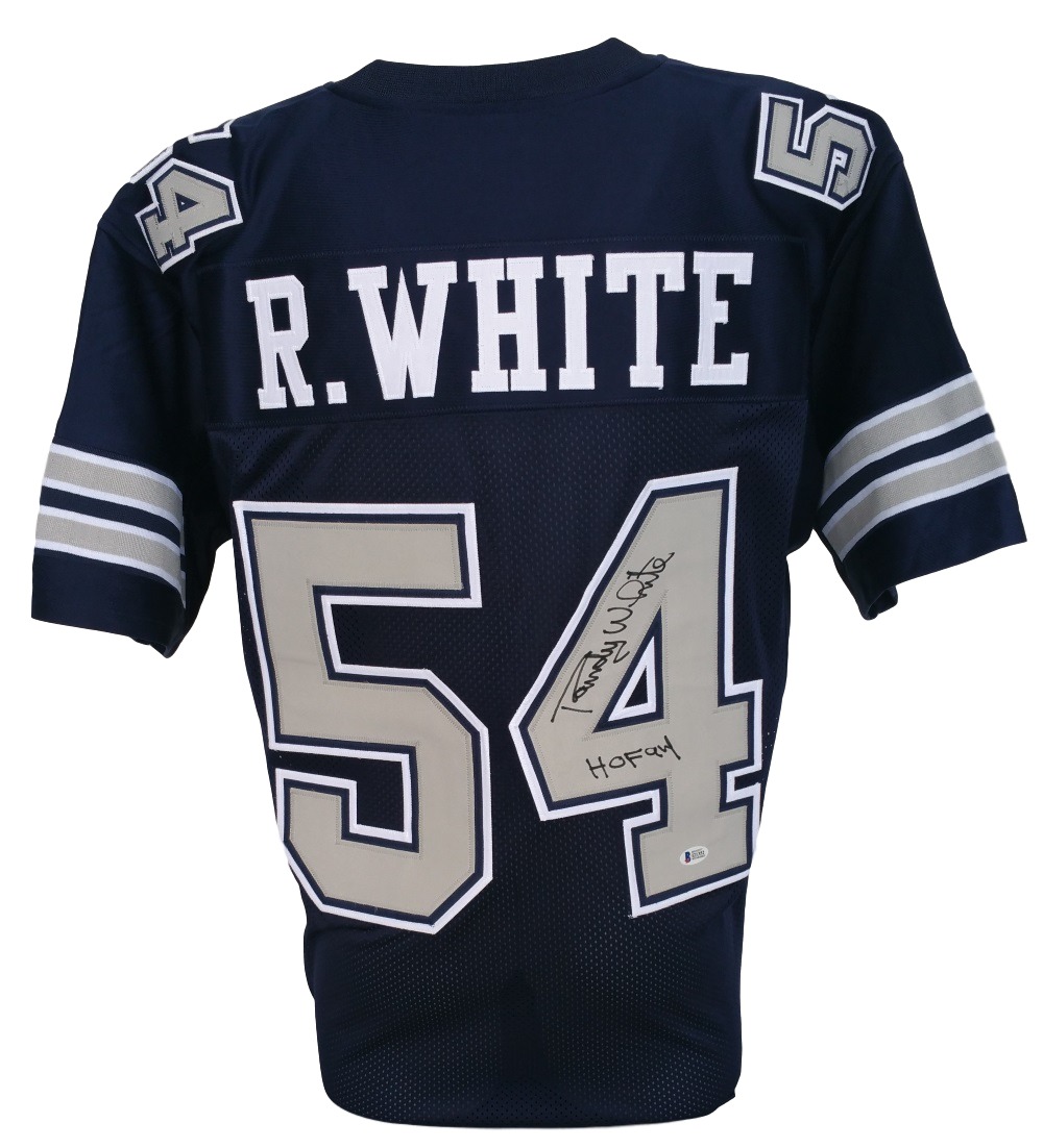 Sports Integrity works with various sports figures. Our product line features hundreds of unique collectables and has been directly involved in the sports memorabilia industry for the past two decades. Our auction services are ideal for all types of events from formal charity dinners golf tournaments and presented in an entertaining and professional style providing a fun approach and flair to fundraising. Featured is a Randy White autographed custom football jersey inscribed HOF 94. This jersey features professionally sewn letters and numbers. This jersey have the Beckett hologram and certificate of authenticity. This is not an NFL jersey. It has no logos tags or emblems. It is intended to be used as a sports collectible. White played professionally for the Dallas Cowboys from 1975 to 1988. He is a member of the College Football Hall of Fame the Pro Football Hall of Fame and the Delaware Sports Museum and Hall of Fame. Features