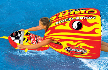 | This single chamber tube is made of 100% heavy-duty PVC and is put over the rider like a shirt instead of being directly attached to the boat. Take it to the beach for the ultimate body surfing experience or grab two SUMOS and have a SUMO wrestling match with a friend! The SUMO SPLASH GUARD (included) is an inflatable armrest/handle with a sleek splash-deflecting design that will keep the spray out of your face. Featuring 6 double webbing foam handles and EVA foam knuckle guards on a heavy-duty full nylon cover. Simply connect a standard tow rope to the SUMO SPLASH GUARD and you can steer the SUMO TUBE back and forth jump the wake and roll 360s! Sumo Tube Features: Sumo Splash Guard Features: Price: 176.67 ![]() |