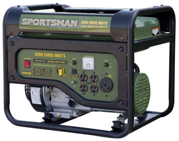 | The Sportsman Series Gasoline 4000 Surge Watt Portable Generator is ideal for powering the RV at the campsite and a great solution for recreational activities as well as for temporary power supply in case of power outages. This 4000 watt unit is the perfect size to take for that weekend getaway to tailgate the game at the stadium or in case you need some temporary power in an emergency situation. It is ideal for hunters and campers running portable TVs radio small stoves grills and other small appliances. This recoil start generator can run for 10 hours with a 50% load on 3.6 gallons of gas. It is equipped with four 120 volt outlets one 120V RV outlet and a 12 volt DC outlet for battery charging. This generator is powered by unleaded gasoline which is a convenient and easy to find fuel source. Choosing a gasoline generator like the Sportsman Series 4000 Watt Portable Gasoline Generator can ease your worry when catastrophe strikes and make your leisure activities even more fun. Features: 4000 surge watts/3500 running watts 7.0 HP 4 stroke OHV engine 3600 RPM 212cc recoil start with engine shut off switch Automatic low oil shutdown AVR automatic voltage regulator circuit breakers Four 120 volt outlets one 120V RV outlet and one 12 volt DC outlet for battery charging 120V 60 Hz Engine run time: 10 hours at 50 percent load Decibel rating: 69 db 3.6 gallon fuel tank fuel type: unleaded gasoline 1 Year Limited Manufacturer s Warranty EPA and CARB approved